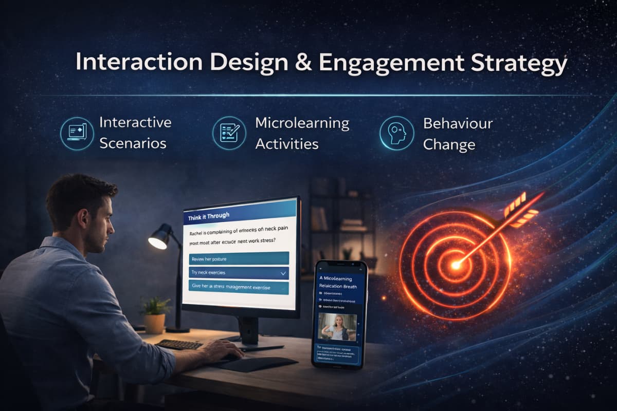 An interactive workplace wellbeing e-learning module developed to help desk-based employees understand the relationship between posture, musculoskeletal discomfort, and stress — and apply realistic prevention strategies within a typical office environment.
